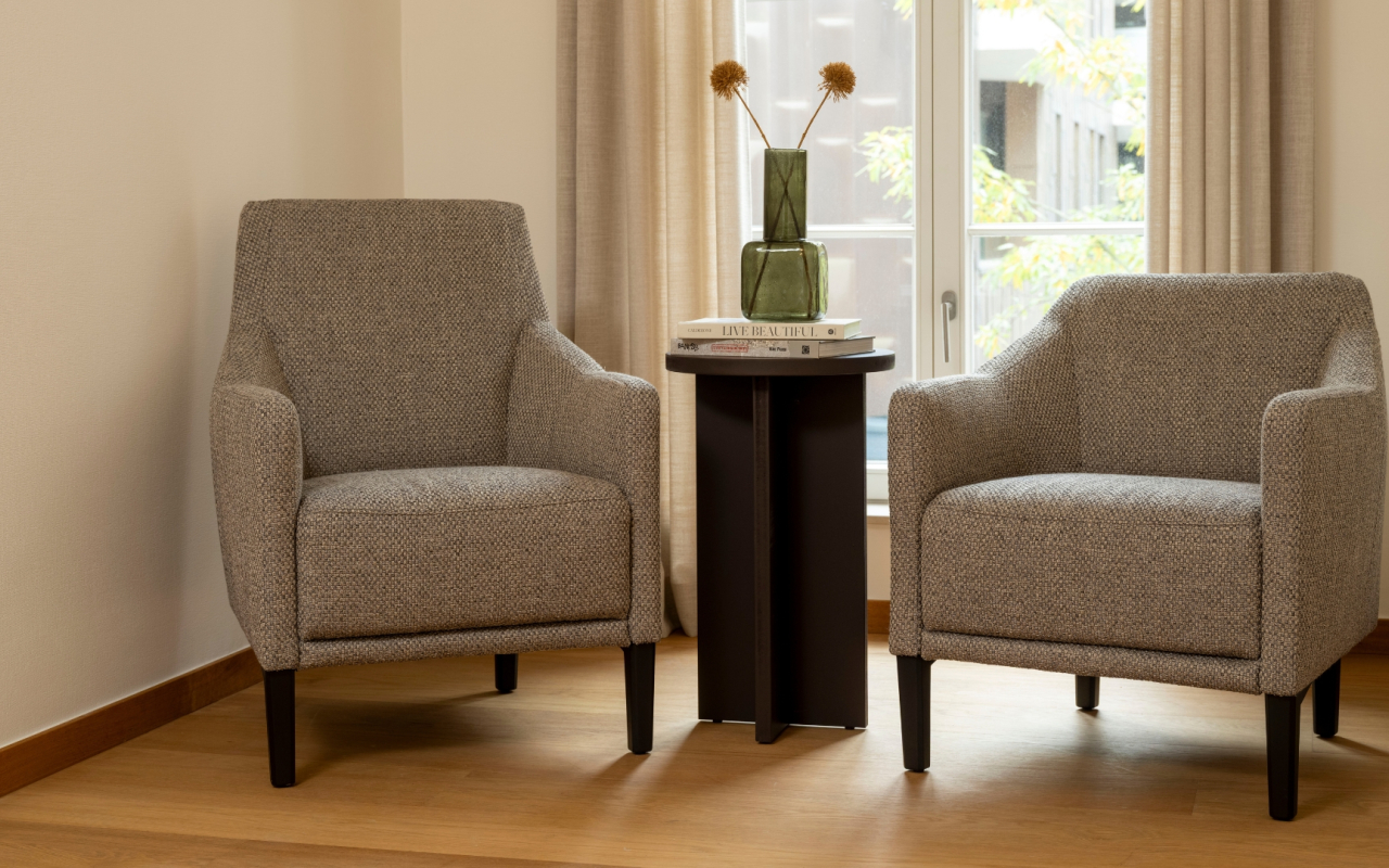 Deze stijlvolle fauteuil straalt een moderne elegantie uit met zijn strakke lijnen en zachte, lichtgrijze bekleding. De subtiel afgeronde armleuningen en comfortabele kussens zorgen voor een uitnodigende uitstraling, terwijl de slanke, zwarte metalen poten een vleugje verfijning toevoegen. Perfect voor een eigentijdse woonkamer waarin comfort en design hand in hand gaan. U kunt voor deze fauteuil kiezen uit een hoge of lage rug