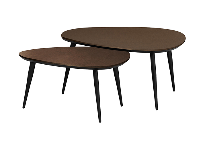 Deze moderne salontafelset bestaat uit 2 ronde tafels met een slank, zwart metalen onderstel en een Lamulux blad van warme kopertinten. Dankzij de verschillende hoogtes schuif je ze speels over elkaar heen of gebruik je ze apart naast de bank.